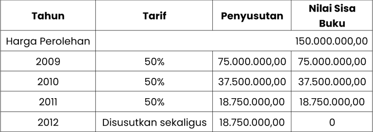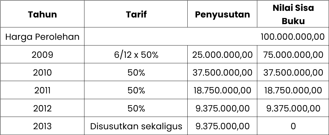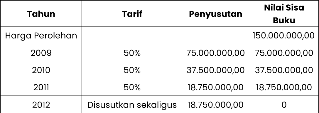 Sebuah mesin yang dibeli dan ditempatkan pada bulan Januari 2009 dengan harga perolehan sebesar Rp150.000.000,00 (seratus lima puluh juta rupiah). Masa manfaat dari mesin tersebut adalah 4 (empat) tahun. Kalau tarif penyusutan misalnya ditetapkan 50% (lima puluh persen), penghitungan penyusutannya adalah sebagai berikut: