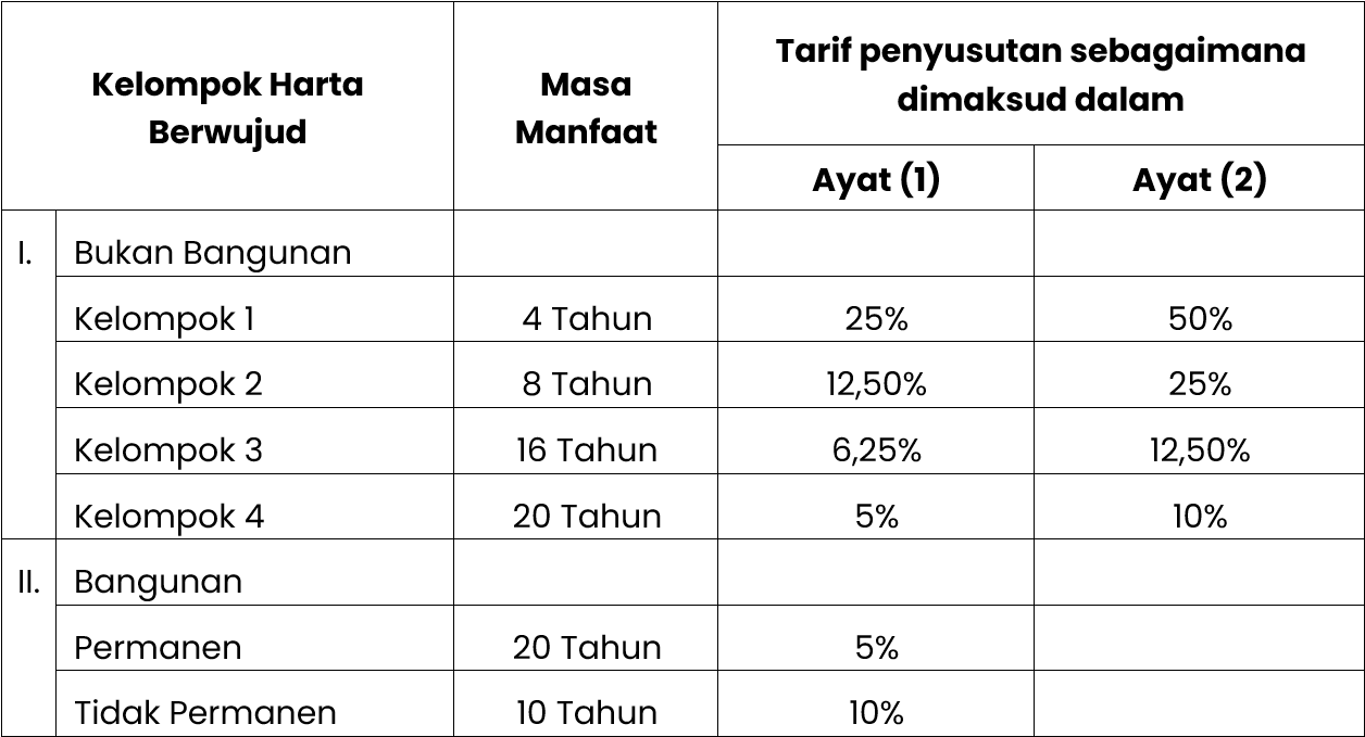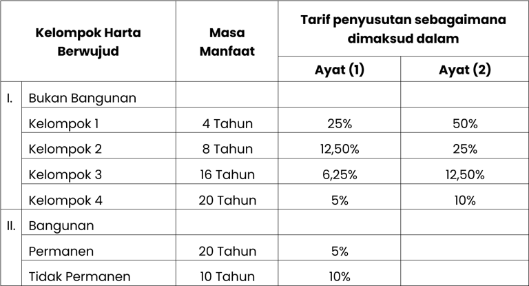 (6) Untuk menghitung penyusutan, masa manfaat dan tarif penyusutan harta berwujud ditetapkan sebagai berikut: (Rev2)