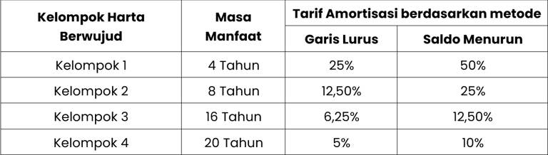 (1) Amortisasi atas pengeluaran untuk memperoleh harta tak berwujud dan pengeluaran lainnya termasuk biaya perpanjangan hak guna bangunan, hak guna usaha, hak pakai, dan muhibah (goodwill) yang mempunyai masa manfaat lebih dari 1 (satu) tahun yang dipergunakan untuk mendapatkan, menagih, dan memelihara penghasilan dilakukan dalam bagian-bagian yang sama besar atau dalam bagian- bagian yang menurun selama masa manfaat, yang dihitung dengan cara menerapkan tarif amortisasi atas pengeluaran tersebut atau atas nilai sisa buku dan pada akhir masa manfaat diamortisasi sekaligus dengan syarat dilakukan secara taat asas. (Rev4)
